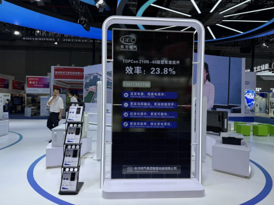 東方光能光伏組件系列產品,適用于分布式、地面電站、海上光伏等多應用場景,本次參展的DEC自主品牌TOPCon 210N-66版型半片雙玻光伏組件,采用N型TOPCon電池技術,發電功率最高達740瓦,轉換效率達到23.8%,電池技術和制造工藝位列行業前列,具有高發電量、低度電成本、高轉化效率、高可靠性、優秀的抗衰減能力、綜合發電更優等特點。